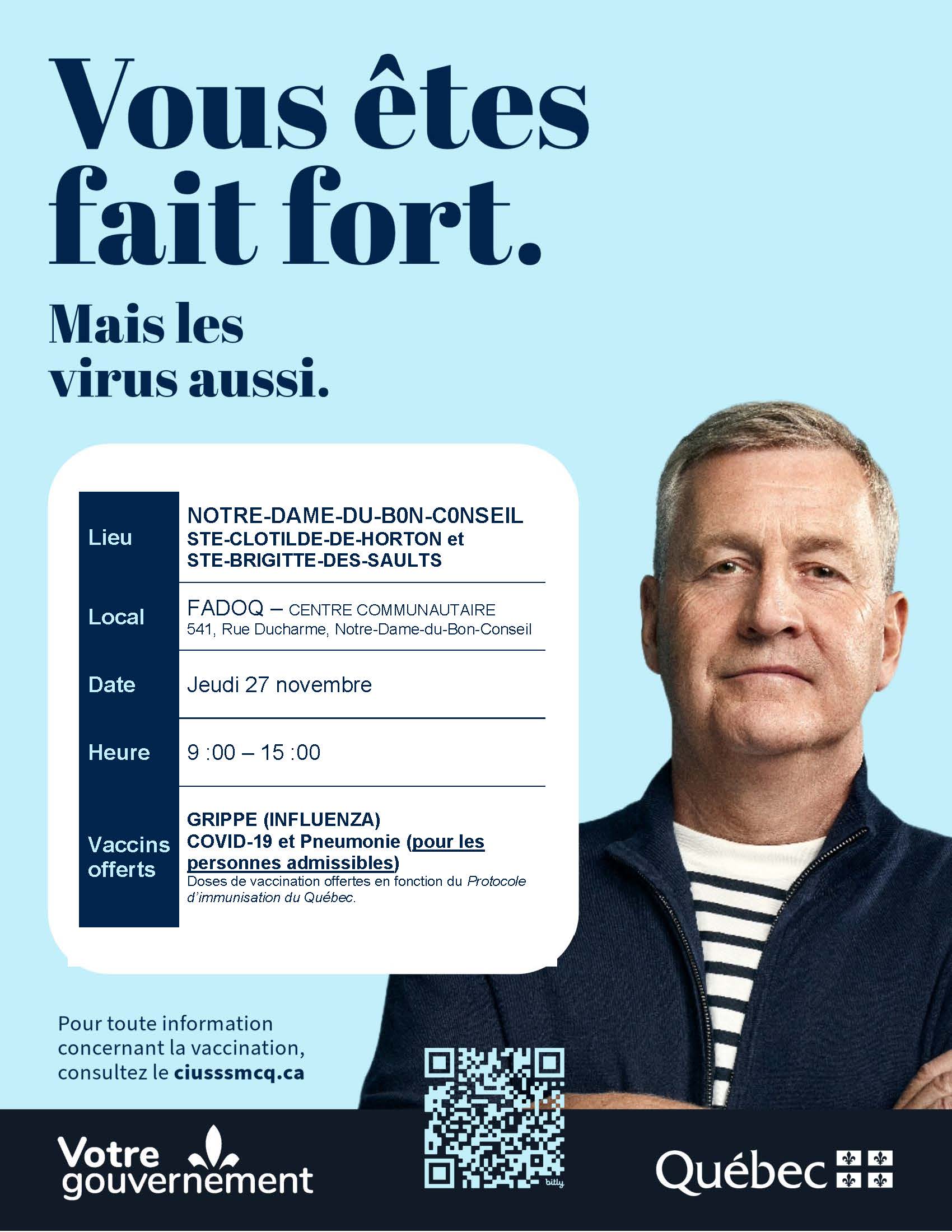 Une clinique de vaccination aura lieu le jeudi 27 novembre de 9 h à 15 h au centre récréatif Léo-Paul Therrien situé au 541, rue Ducharme à Notre-Dame-du-Bon-Conseil.