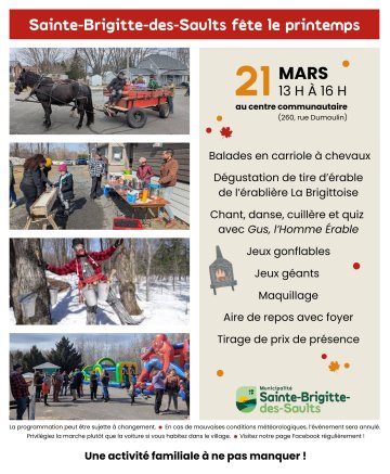 L'événement « Sainte-Brigitte-des-Saults fête l'arrivée du printemps » aura lieu le samedi 21 mars de 13 h à 16 h sur le site du centre communautaire.