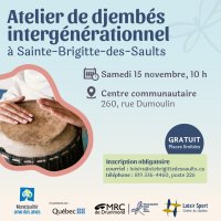 Rythme, énergie, bonne humeur et spontanéité! Venez participer à un atelier de djembés intergénérationnel. Une activité rassembleuse qui aura lieu le samedi 15...